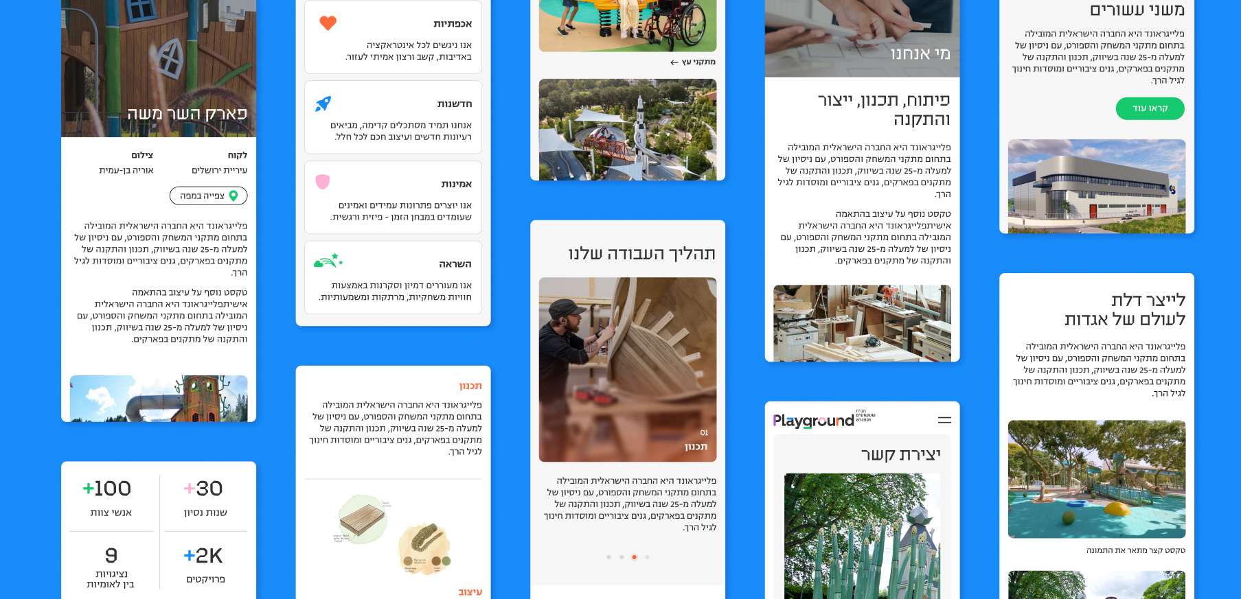 Playground מבית שעשועים וספורט היא החברה המובילה ומהותיקות בישראל בתחום מתקני שעשועים וספורט, עם למעלה מ-25 שנות ניסיון בשיווק, תכנון והתקנת ציוד בפארקים, מרחבים ציבוריים ומרכזי חינוך לגיל הרך.